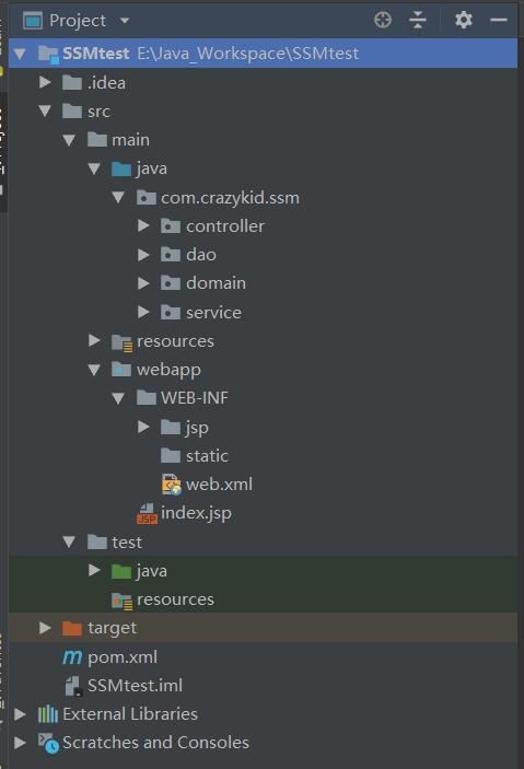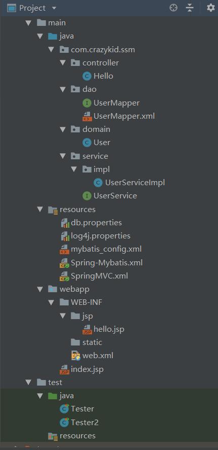 在 main 里分别创建 java、resources 文件夹,并分别 右键 > Mark Directory as > Source Root 和 Resource Root ,标记 java 程序的主文件夹和资源文件夹;返回上一层,在 src 里创建 test 文件夹,在 test 里创建 java 和 resources 文件夹,并分别 右键 > Mark Directory as > Test Source Root 和 Test Resource Root 。在 webapp/WEB-INF/ 下创建 static 和 jsp 文件夹,分别存放静态资源和 jsp 网页模板。