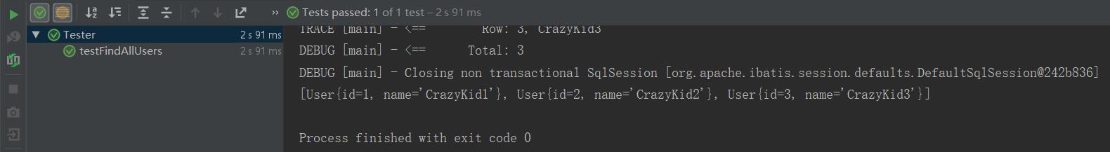 1 2 3 4 5 6 7 8 9 10 11 12 13 14 15 16 17 18 import com.crazykid.ssm.domain.User;import com.crazykid.ssm.service.impl.UserServiceImpl;import org.junit.Test;import org.springframework.context.support.ClassPathXmlApplicationContext;import java.util.List;public class Tester { private UserServiceImpl userService; @Test public void testFindAllUsers () { ClassPathXmlApplicationContext context = new ClassPathXmlApplicationContext("Spring-Mybatis.xml" ); userService = (UserServiceImpl) context.getBean("userServiceImpl" ); List<User> list = userService.findAllUsers(); System.out.println(list); } }